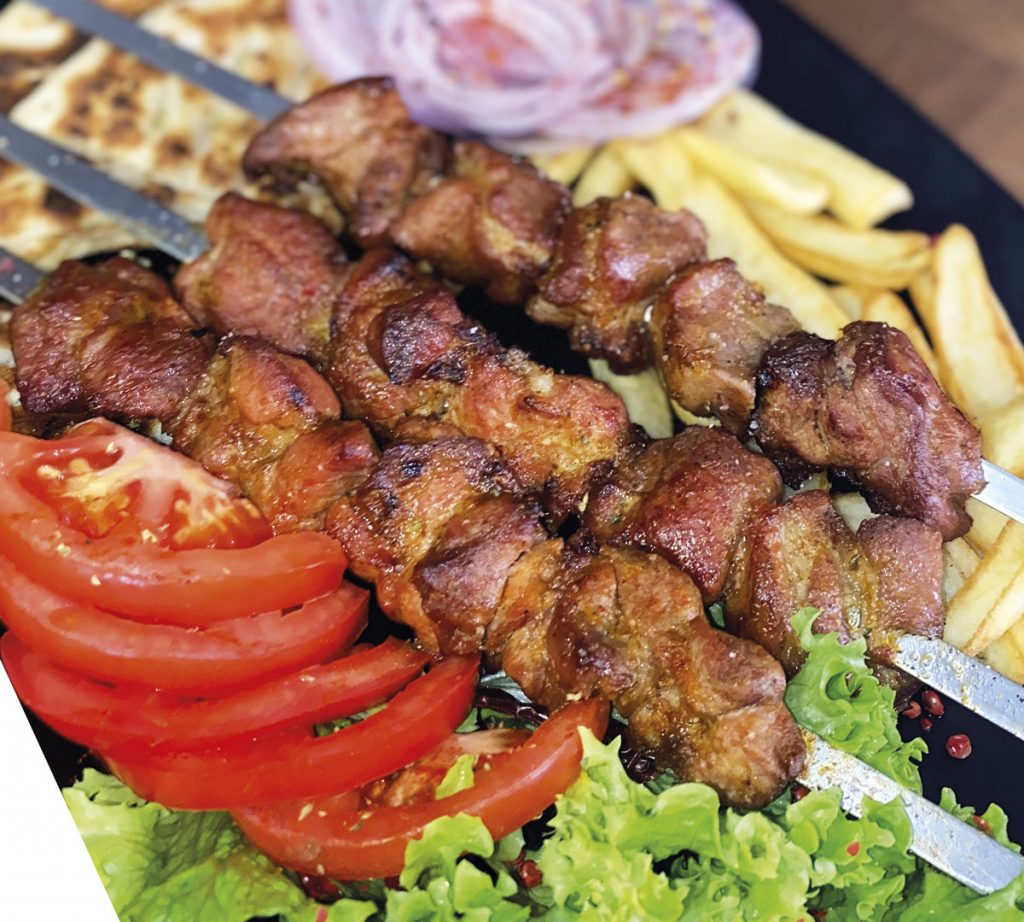 1 ρωσικό χοιρινό, 1 καλαµάκι χοιρινό, 1 λουκάνικο, 1 κεµπάπ, γύρο χοιρινό, γύρο κοτόπουλο, 2 πίτες, ντοµάτα, κρεµµύδι, τζατζίκι, τυροκαυτερή, πατάτες